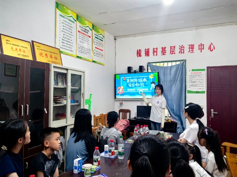 梳鋪村內池塘、河流縱橫交錯,既是鄉村美景,也是孩子們玩耍時潛在的溺水隱患點。針對這一情況,踐行團的成員們組織村里的20余名小朋友在村委會活動中心,開展了防溺水的宣傳活動。