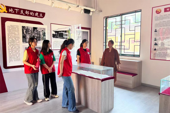 隨后,在福慧寺住持聶紅玉(演玉)的帶領下,團隊成員前往平潮西鄉地下黨支部舊址,深入了解地下黨支部的創建和發展史。“為在敵人的嚴密監視下站穩腳跟,支部將秘密據點選在了三余廟佛堂,也就是如今的福慧寺。”通過舊址內的歷史陳列,包括革命文物、復刻場景和圖文展板,團隊成員了解到西鄉地下黨支部在抗日戰爭時期的各種秘密活動,同時也感悟到僧人群體在抗戰中“出家不忘救國”的愛國情懷。團隊員們深切感受到,這座寺廟不僅是精神修行的場所,更是愛國僧眾與革命者并肩作戰的紅色堡壘,那份超越宗派的家國情懷,在歲月長河中愈發閃耀著動人的光芒。