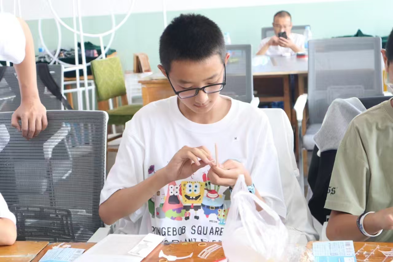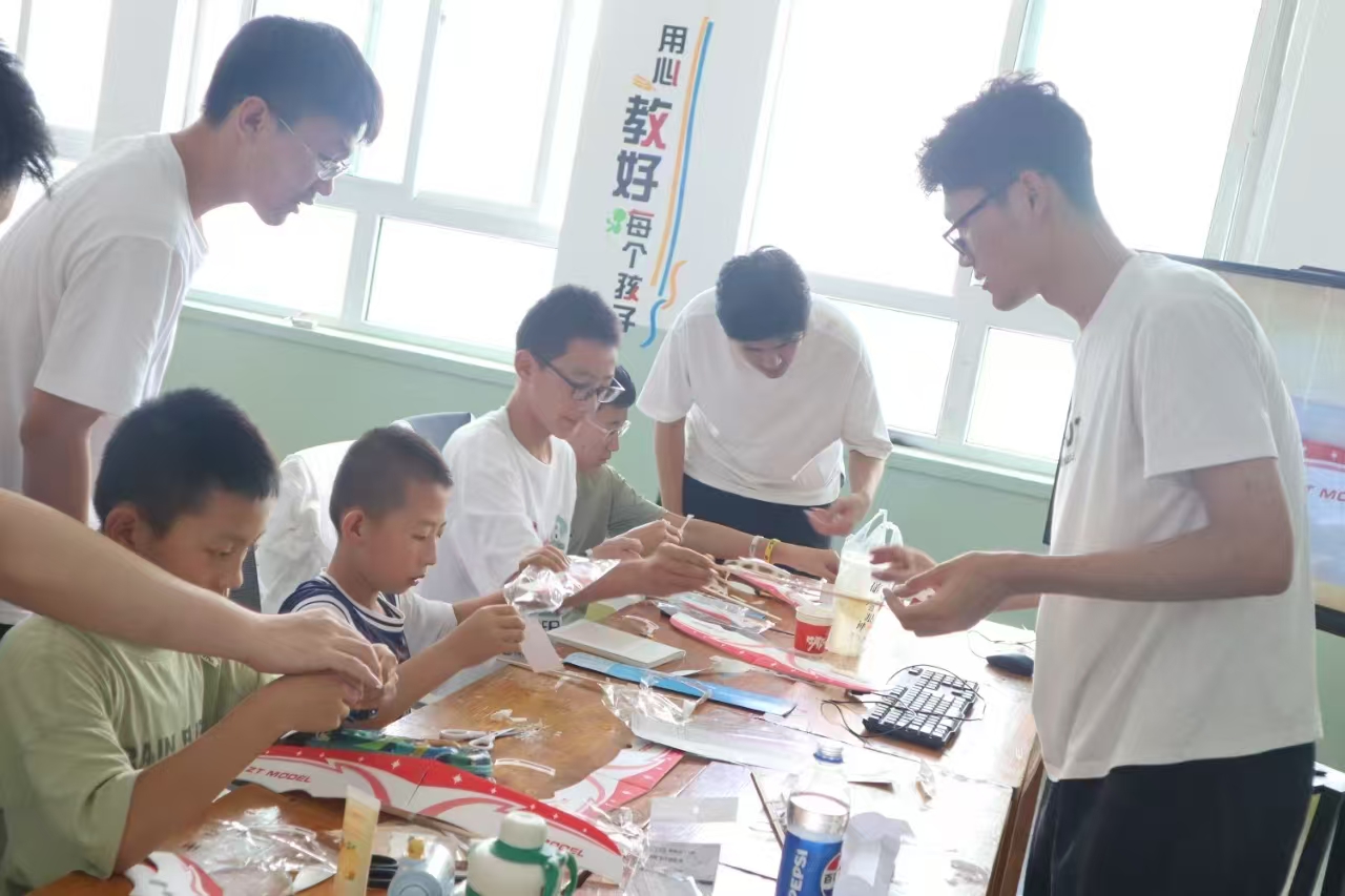 在實踐環節,支教團成員耐心地分步驟指導航模的制作過程,并親自動手,帶領孩子們一步步完成。從機身起始,逐步粘貼機翼、動力裝置等部件,細致入微地完成每一個步驟。安裝完成后支教團成員幫助孩子們完善細節,助力孩子們的“飛天夢”啟航。