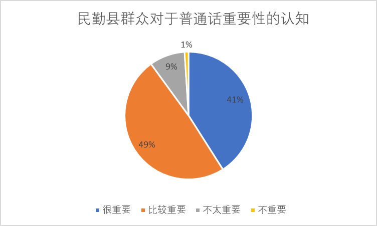 調查顯示,民勤縣群眾認為普通話很重要的占49%,認為比較重要的占41%,認為不太重要的占9%,認為不重要的占1%。據此數據分析,大部分群眾對普通話的認識比較積極,但有少部分群眾對于普通話的認識還比較消極,這表明雖然我國推普事業取得了一定成果,但推普的工作依然任重道遠。