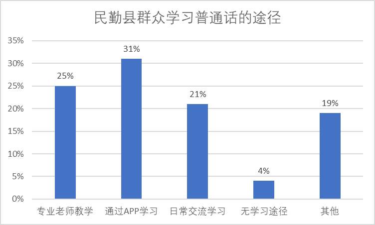 調查顯示,民勤縣群眾通過專業老師教學學習的占25%,通過APP學習的占31%,日常交流學習占21%,無學習途徑占4%,其他占19%。據此分析認為,大部分人學習普通話主要是通過媒體、日常交流來自學,一部分學生和專業領域的工作可能有專業的普通話老師教學,可見目前普通話學習途徑相對過去有所擴大,主要還是依托于現代科技水平的提升。