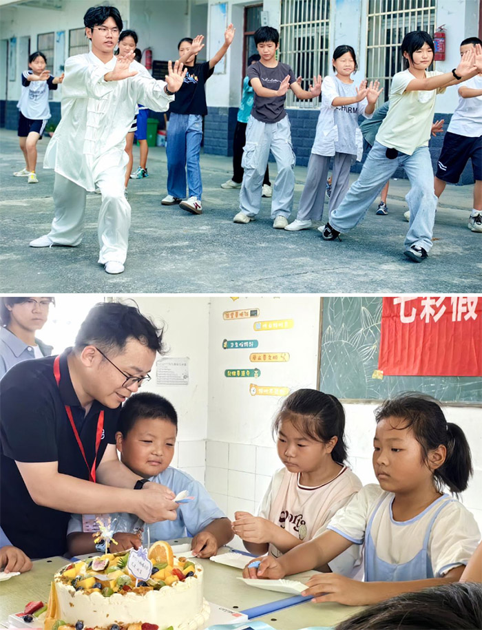 紫色育苗:童心沃土播種未來希望 黃泊渡小學里,歡聲笑語不斷。實踐團為30多名留守兒童精心設計了“七彩假期”夏令營。紅色課堂上,孩子們學唱紅歌、聆聽黨史故事;綠色課堂上,大家動手繪制環保袋、種植小盆栽;青色課堂上,神奇的“藍瓶子”實驗引得陣陣驚嘆......“老師,我長大了也要當醫生!”實踐團還為所有孩子們準備了溫馨的集體生日會,燭光中,孩子們許下心愿、分享蛋糕,感受家一般的溫暖。
