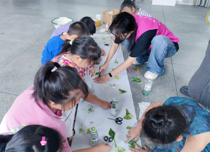 接著,在團隊成員程婭林的耐心指導下,孩子們開始動手制作。他們將植物放在宣紙下,用小錘子輕輕敲打,植物的形狀和色彩逐漸清晰地呈現(xiàn)在宣紙上。當一幅幅精美的植物拓印作品完成時,孩子們臉上洋溢著自豪的笑容。通過這次體驗,孩子們不僅親手感受到了非遺技藝的魅力,更在心中種下了傳承和保護傳統(tǒng)文化的種子,讓古老的非遺在新時代綻放出別樣的光彩。