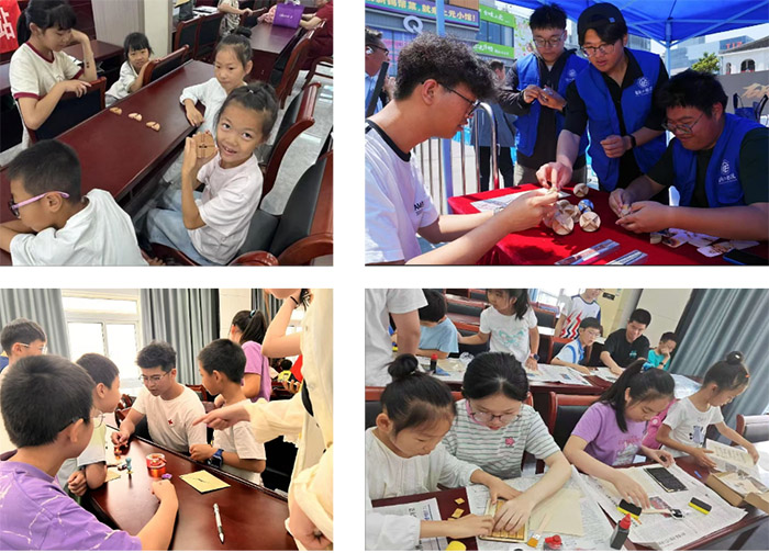 構建七彩匠心課堂,在實踐中悟“智”造 在深入調研外來務工子女需求后,團隊40名志愿者兩兩結隊開始進行主題探討、課程設計、ppt制作、物資采買等準備工作。“解鎖東方密碼——魯班鎖工程教育體驗”“精雕細琢之藝術拓印”“魅力火漆印章”“智能制造科普——大國工匠精神傳承”等20余場“七彩匠心課堂”,讓孩子們獲得了“心”與“智”的新體驗。晴山藍城社區周利副書記在活動開展后表示:孩子們非常喜歡這群哥哥姐姐的到來,不僅能夠學到實用的科技知識,更能體驗到動手實踐的樂趣,為暑期體驗增添了更豐富的元素。