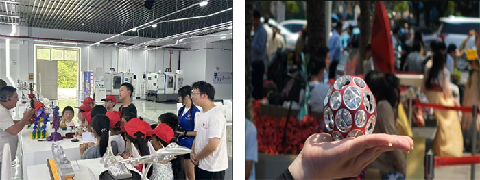 探索制造實訓基地,在觀摩中見真章 “這個坦克也太精致了吧!是用剛才看到的五軸加工機床生產的嗎?它有多少個零件呀?”孩子們對眼前看到的智能制造產線、精密制造展品充滿了好奇。在志愿者的引導下,孩子們逐漸了解亞運會頒獎花器、“筆筒上的螞蟻”、艾菲爾鐵塔、陸空兩棲無人機等展品的加工工藝,切實感知智能制造的精密所在。在全國勞動模范陳亮的技能大師工作室里,孩子們聆聽了從一線工人蛻變為全國勞動模范的工
