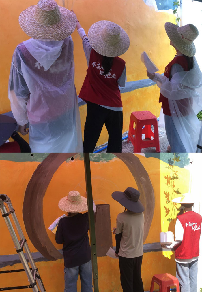基于前期對當地文化的深度調研,團隊以墻繪創作為核心,將文化元素轉化為視覺語言,助力連州鎮完成人居環境的煥新升級。在車戰村外墻,隊員們完成近一百平方米的“鄉村振興主題墻”,將調研中提煉的農耕場景、特色物產等元素融入畫面——無論是田間勞作的生動場景,還是本地物產的鮮活呈現,都源自對鄉土文化的細致觀察。過去斑駁脫落的墻面由此蛻變為展現鄉村風貌的“立體畫卷”,讓熟悉的田園風光以藝術化的方式呈現,成為鄉村風貌的一道亮眼風景。