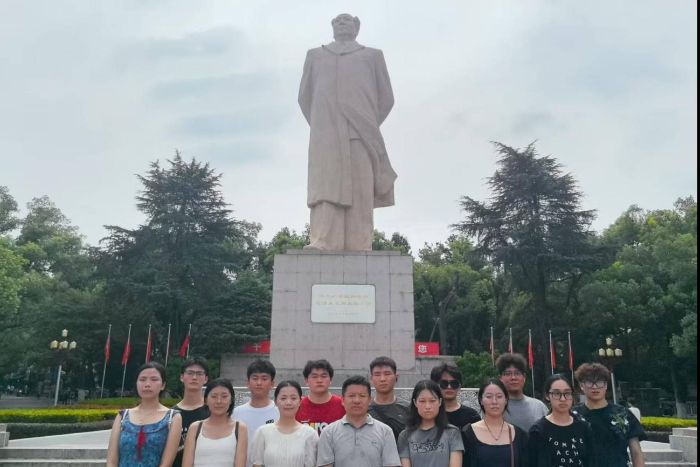 (圖一團隊成員在青年毛澤東藝術雕像前合影)