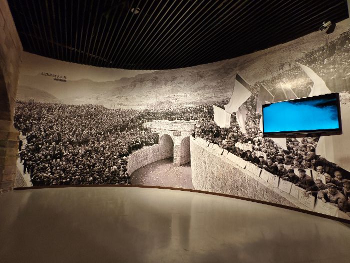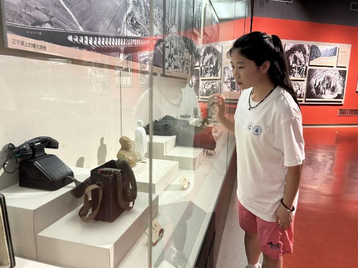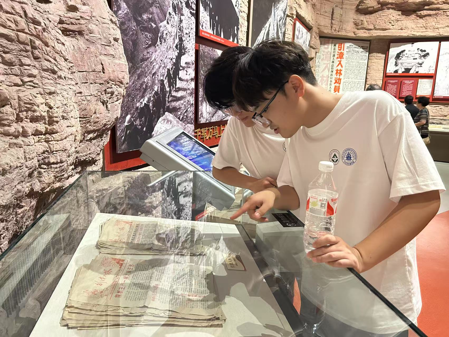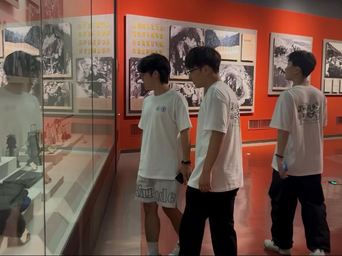 在紀念館內,實踐團成員跟隨指引標牌,系統了解紅旗渠工程從艱難立項到全面竣工的全過程。展柜中陳列的修渠者攀崖鑿石時使用的鐵錘、鋼釬,墻上懸掛的泛黃老照片,以及"青年洞""凌空除險"等場景復原,將隊員們帶回那個戰天斗地的年代。當看到"一錘一釬一雙手,劈開太行穿山來"的實景展示時,隊員們紛紛感慨道"這些布滿裂痕的工具,分明是先輩們用血肉之軀刻下的精神圖騰。"
