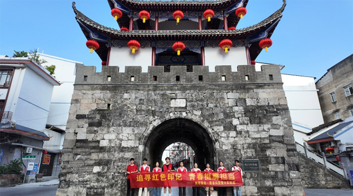 隨后,實(shí)踐團(tuán)成員來到四牌樓遺址。歷經(jīng)風(fēng)雨的磚石拱門爬滿藤蔓,門楣上模糊的刻痕仍能辨認(rèn)出當(dāng)年的繁華印記。陽光穿過拱洞灑落,在地面投下斑駁光影,仿佛將百年歲月壓縮成一瞬。成員們輕撫冰涼的磚石,感受著歷史的厚重——這里曾是商貿(mào)往來的樞紐,也曾見證過革命年代的熱血沸騰。如今,古老遺址與青春身影在此相遇,實(shí)踐團(tuán)成員在靜默中與過往對(duì)話,愈發(fā)明白紅色基因的傳承,正是要在這樣的歷史現(xiàn)場,接過先輩們的精神火炬,用當(dāng)代青年的擔(dān)當(dāng)續(xù)寫新的篇章。