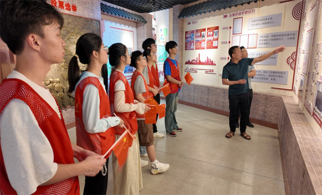 7月8日上午,南寧理工“青音向黨螢火實(shí)踐團(tuán)”出發(fā)前往“中國第一個(gè)村民居委會”,為深入感悟紅色精神,厚植家國情懷,同學(xué)們首先參觀了村史展覽館。館內(nèi)珍貴的照片、實(shí)物和文獻(xiàn)資料,生動再現(xiàn)了該村作為新中國基層民主建設(shè)“居委會”的輝煌歷程,以及幾代村民在黨的領(lǐng)導(dǎo)下艱苦奮斗、開拓創(chuàng)新的感人故事,走進(jìn)村史展覽館,時(shí)光仿佛在此沉淀。泛黃的老照片里,記錄著新中國成立初期村民們圍坐在簡陋的土坯房前,熱烈討論村務(wù)的珍貴場景——那是中國基層民主最早的生動實(shí)踐。玻璃展柜中,一本1954年手寫的《村民自治章程》格外醒目,工整的鋼筆字跡雖已褪色,但"民主選舉""集體決議"等字句依然清晰可辨,見證著村民們"自己的事情自己管"的樸素智慧。