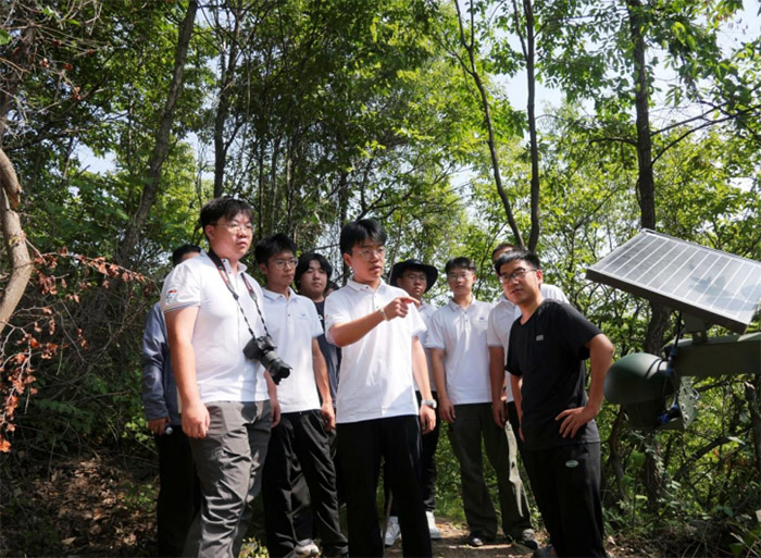 管護站工作人員展示了服務器、紅外相機、動物音頻監測設備等,詳解數據傳輸流程:設備采集的信息經無線擴網器、合網器匯總至鐵塔,再通過無線網橋傳至服務器分析。實踐團成員深入探討設備運行與數據安全問題,并在工作人員帶領下深入林區,實操紅外相機與音頻設備——前者通過紅外感應捕捉紅嘴藍鵲等鳥類影像,后者依托算法識別鳥類叫聲。