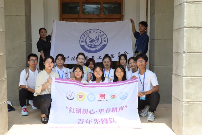 圖為云南師范大學云南師范大學華文學院、國際漢語教育學院“紅銅初心·華青新聲”青年先鋒隊與東川法院青年工作委員會的工作人員在原東川一中校史陳列室門口的合照。馬梓丹供圖。