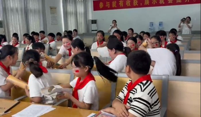 7月27-28日,淮北師范大學教育學院“薪火照皖北,紅燭育童心”暑期“三下鄉”社會實踐團隊,深入安徽省淮北市雙堆集明德小學,開展了一場別開生面的紅色文化傳播活動。團隊成員充分發揮專業所長,通過精心設計的心理團輔課與音樂課,寓教于樂,引導小學生們在游戲互動與歌聲中感悟淮海戰役的“小推車”精神,并與青年教師深入交流紅色文化教育心得。
