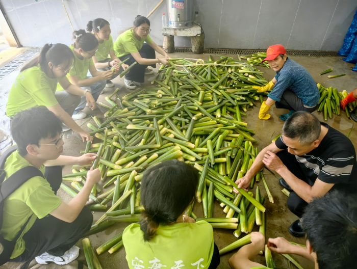 實踐團深入梨山村茭白種植基地,實地探訪產業轉型成效,成員隨基地負責人易叔叔走進田間,聽其細數產業變遷:“以前種水稻,農戶僅能自給自足;改種茭白后,依托‘合作社+農戶’模式及水旱輪作、綠色防控等技術,每畝收益已突破8000元。” 在蔥郁的茭白田間,團隊成員圍繞種植技術與病蟲害防治等環節展開深入交流。為直觀展示生長差異,負責人易叔叔特意采摘了處于不同發育階段的茭白樣本進行對比講解,隊員們俯身細察、不時交流;團隊成員胡博卿和朱魏斌現場品嘗新采收的茭白,切身感受作物品質。談及產業帶動作用,易叔叔望著連片茭白田感慨道:“村里老人閑時來幫忙打包茭白,也算為村莊發展出了力。”但提到運輸難題,他眉頭微蹙:“山區交通不便,好東西運出去難,這是目前發展的一大瓶頸。”