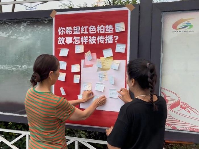 在深入探訪紅色歷史、助力鄉村產業發展的基礎上,實踐團成員進一步聚焦紅色文化的傳播與活化工作。海報以醒目的紅色為主色調,融合柏墊鎮革命歷史元素,以“你希望紅色柏墊故事怎樣被傳播”的問題,面向群眾收集對紅色文化傳播形式的偏好和建議?;顒蝇F場,不少居民起初駐足觀望、心生好奇。團隊成員主動上前熱情邀請,引導大家填寫意見與想法;互動過程中,團隊同步了解了柏墊紅色資源的開發現狀與傳播痛點。通過這次調研,搭建了一個簡易的平臺讓居民表達對紅色文化傳播的看法,真實反映了柏墊民眾對柏墊的了解與認知。