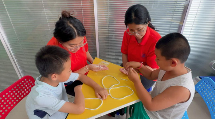 圖為志愿者開展特色課程“串珍珠項鏈”(彌佳男 供圖)