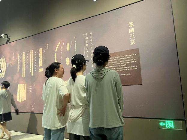 7 月 18 日,她們走進壽縣博物館安徽楚文化展廳,開啟一場與歷史對話的旅程。?展柜中,戰國 “郢爰” 金版靜靜陳列,金黃光澤里藏著當年窖藏出土的傳奇。隊員們凝視著邊緣的切割痕,望見古人以金易物的市井煙火。?開元寺銅鐘沉默佇立,斑駁鐘體似仍回蕩著千年梵音。八龍金代扣的龍紋栩栩如生,金箔的流光中,展示著巧奪天工的工藝。 ?越王者旨於刺劍鋒芒依舊,劍鞘的紋飾訴說著吳越爭霸的風云。金棺的鎏金歷經滄桑,依舊閃耀著信仰的溫度。觸摸著展柜玻璃,隊員們都讀懂了楚文化的厚重與璀璨。