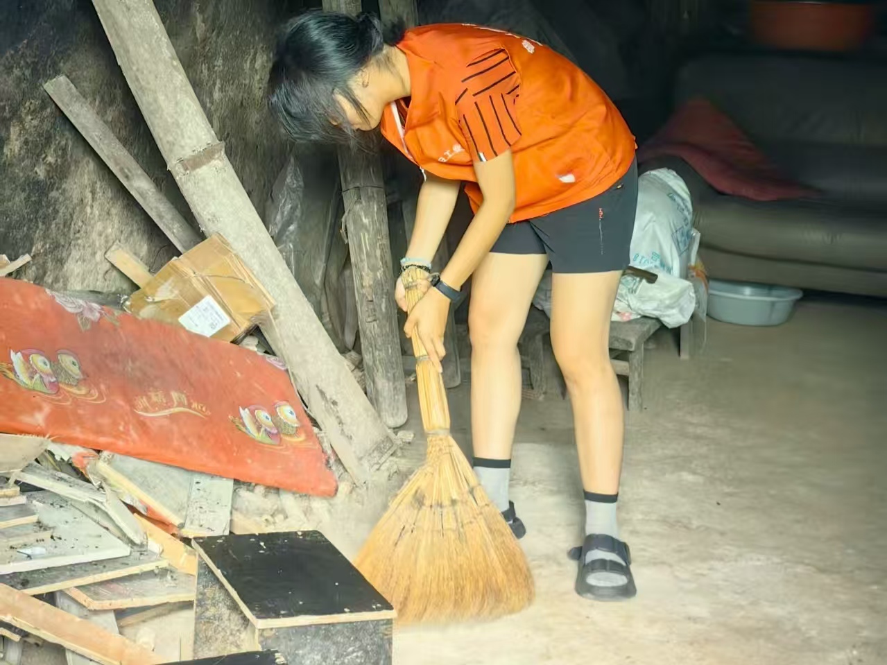 “十二點太陽差不多在頭頂,有點偏東。”羅奶奶指著遠處的天講到,蹲坐門檻上發呆是奶奶主要的狀態。由于城鎮化加快,勞動力外流,村里空巢老人越來越多,他們如同羅奶奶一般落寞等待著子女。隊員們意識到不僅要推普,更要送暖,于是發放物資,為行動不便老人打掃院落。