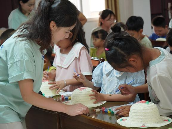 在千丈村,實踐隊向老人們普及移風(fēng)易俗知識并送上慰問品,傳遞青年學(xué)子的關(guān)懷與敬意;為留守兒童開設(shè)美育課堂,開展草帽涂鴉活動,暖心陪伴的同時引導(dǎo)他們用色彩點亮童年夢想。