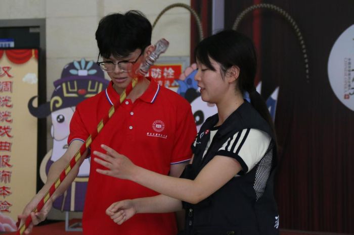 實(shí)踐團(tuán)踏入漢調(diào)桄桄文化展覽館,仿佛推開一扇通往秦風(fēng)蜀韻的大門。泛黃的戲文手稿、斑駁的油彩臉譜、歷經(jīng)滄桑的戲袍,無聲訴說著這門古老藝術(shù)的厚重。老師先示范了基本動作,強(qiáng)調(diào)握槍姿勢和手腕發(fā)力的技巧。團(tuán)隊(duì)成員接過花槍時(shí),發(fā)現(xiàn)槍桿比預(yù)想的更沉,紅纓隨動作晃動,需要控制力度才能保持平衡。 |