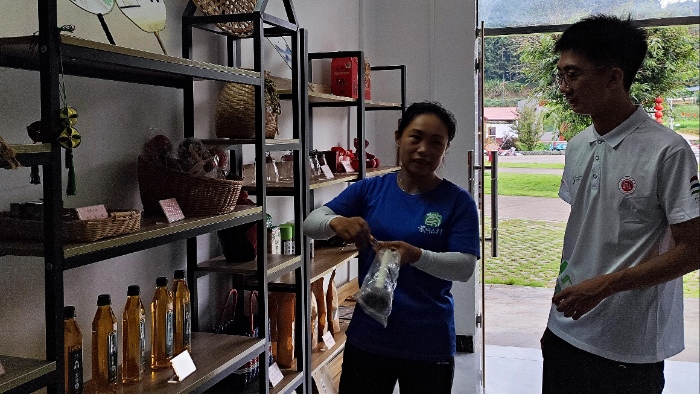 7月27日上午,在工作人員蓮姐的生動講解中,隊員們深入了解了蒙峒古村的特色物產。蓮姐重點介紹了村里種植的500多畝山楂及其深加工產品——山楂芽茶,強調其降三高、開胃健脾的功效,并說明這是村民種植、合作社回收助農的特色產品。她還展示了當地優質的連山絲苗米,以及蘊含保健智慧的紫蘇泡腳包(內含紫蘇梗與姜葉)。引人注目的還有利用本地藥材制作的山蒼子錘(內裹山蒼子)和山蒼子精油,后者兼具驅蚊與暈車提神之效。對于家家必備的茶籽油,蓮姐分享了其雙重妙用:不僅是健康食用油,更能用于新生兒護理(清潔胎脂)和緩解冬季皮膚干燥,充分體現了壯瑤生活智慧。