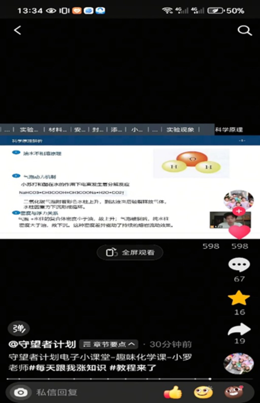 趣味學(xué)科啟蒙,《自制熔巖燈實(shí)驗(yàn)》等課程參與度100%,多名學(xué)生完成“家庭小實(shí)驗(yàn)”作業(yè),電子小課堂由羅恒、王麗麗等老師錄制,單條2-5分鐘,發(fā)布于抖音號“守望者計(jì)劃”,極大地激發(fā)了孩子們的學(xué)習(xí)興趣,課程參與度達(dá)到100%。其中,多名學(xué)生還積極完成了“家庭小實(shí)驗(yàn)”作業(yè),將課堂所學(xué)延伸至生活實(shí)踐。同時,羅恒、王麗麗等老師錄制了2-5分鐘的電子小課堂,發(fā)布于抖音號“守望者計(jì)劃”。這種形式降低了授課門檻,能夠便捷化地傳播科學(xué)知識,讓更多孩子和家長受益,教學(xué)效果頗為顯著。