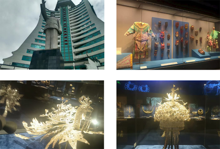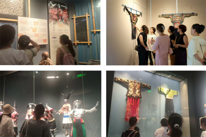 7月7日,團隊懷揣對民族文化交融的好奇啟程,首站抵達貴州民族博物館。踏入館內,布依族織錦、苗族銀飾、水族古籍有序陳列,復原民俗場景里,“先民”圍坐火塘,蠟染布隨竹架擺動,紡車咿呀似在耳畔。講解員從生產工具講到婚戀習俗,布依族的生活智慧、苗族的自然敬畏、水族的文化傳承,在講解中化作立體認知,為同學們解鎖黔南非遺拼花的文化背景,埋下探索伏筆。