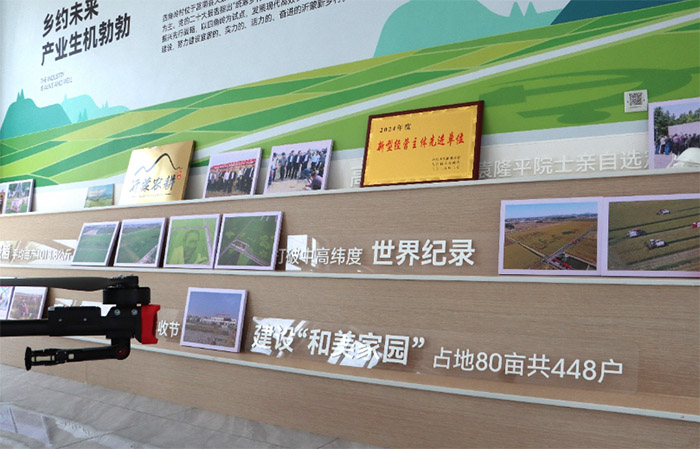 團(tuán)隊(duì)最后一站來(lái)到村農(nóng)業(yè)成果展廳。展臺(tái)上,該地的各色農(nóng)產(chǎn)品琳瑯滿目,呈現(xiàn)了村莊多元發(fā)展的產(chǎn)業(yè)格局。在這里,團(tuán)隊(duì)獲悉了四角嶺村載入史冊(cè)的輝煌一頁(yè)——2016年,袁隆平院士親臨指導(dǎo)水稻試驗(yàn),成功創(chuàng)下畝產(chǎn)1013.8公斤的世界高緯度地區(qū)糧食單產(chǎn)紀(jì)錄。這一里程碑不僅是村莊的榮耀,更是科技力量在糧食安全領(lǐng)域的有力背書(shū),為村莊特色農(nóng)產(chǎn)品的培育和發(fā)展奠定了堅(jiān)實(shí)的科技基礎(chǔ)。