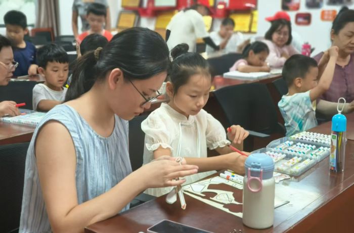 圖為小朋友與媽媽一起制作皮影。 潘雨彤 供圖