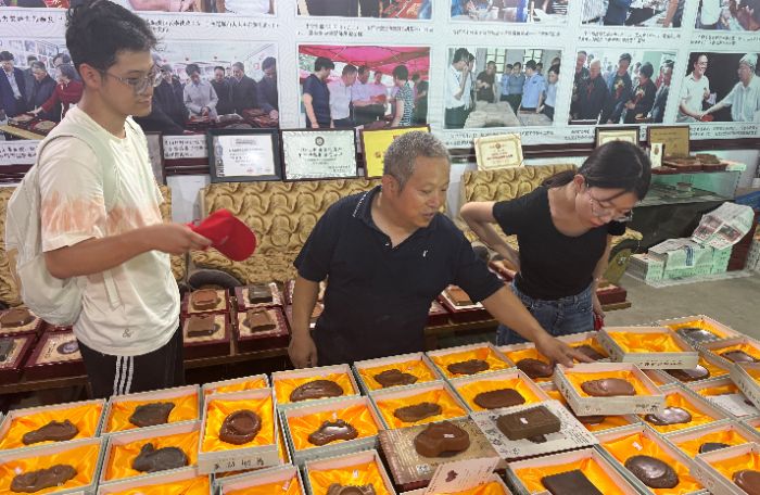 圖為成員們在胡發偉老師的指導下體驗皮影。 劉恬靜 供圖八月四日,實踐團來到山西省運城市新絳縣,探訪絳州澄泥硯研制生產基地。實踐團由一位專職負燒窯的技術師傅帶領參觀。從泥料的選取與過濾,到泥胚的塑形與雕刻,再到最終的燒窯與后期處理,隊員們走過不同的生產分區,了解澄泥硯誕生的全過程。在結束生產區域的參觀后,講解人帶領隊員來到陳列著各式硯臺成品的展覽室,著重介紹了澄泥硯豐富的文化意象,如“十二生肖系列”、“荷塘月色系列”等珍品組合,并結合展板講述了目前澄泥硯制作技藝國家級代表性傳承人藺濤先生的事跡。