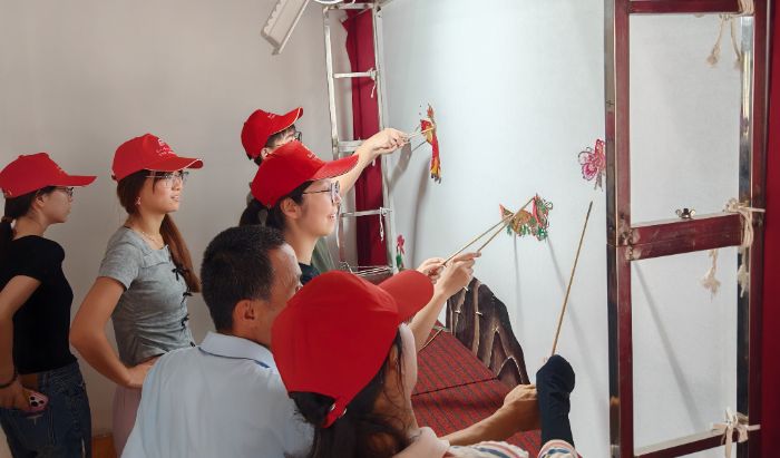 八月二日和八月三日,晉韻遺風實踐團在孝義市參觀皮影博物館,并且去到胡發偉老師皮影工作室。胡發偉老師是孝義皮影國家級非遺傳承人,曾獲“山西省工藝美術大師”及“全國自強模范”稱號。在他主辦的智力殘疾人及親友協會皮影制作培訓基地里,隊員們觀賞了皮影經典劇目“仙鶴戲龜”,并與制作者們深入交談,針對現場實物,探討了有關皮影原料、制作工藝、演出等各個環節的知識與細節,欣賞了室內陳列的各式傳統的以及創意創新的皮影作品。在與老師的交談中了解皮影藝術的來源、發展及現狀,同時成員們還親自體驗了皮影戲,認真感受皮影藝術的魅力。