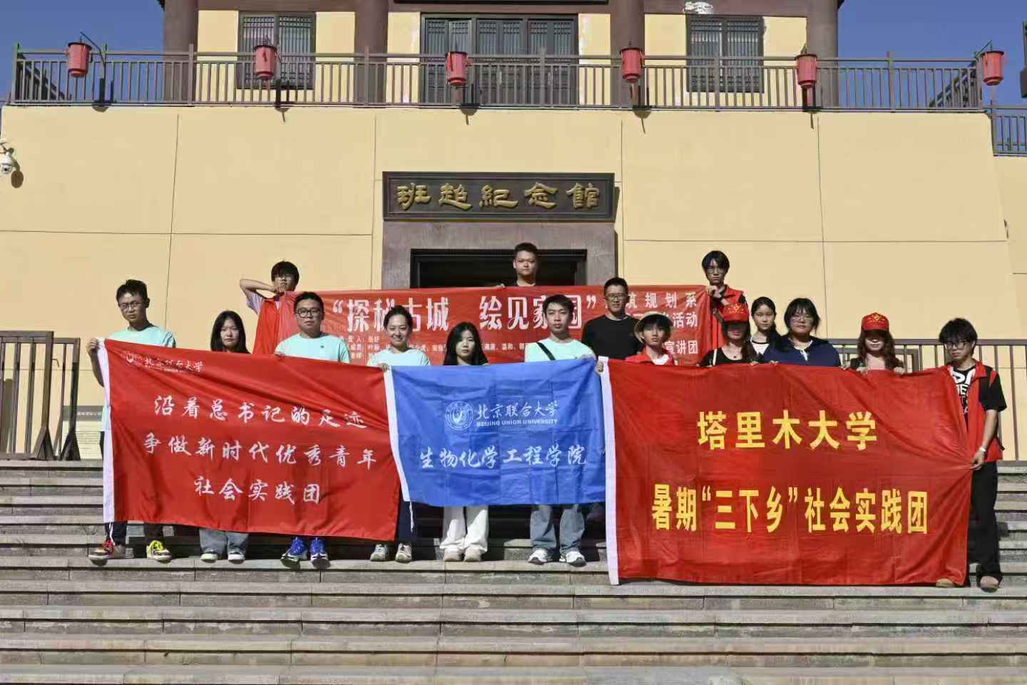 (圖為團隊成員在班超紀念館前與北京聯合大學三下鄉團隊的合照 北京聯合大學生物化學工程學院張益熒 任紫渲供)