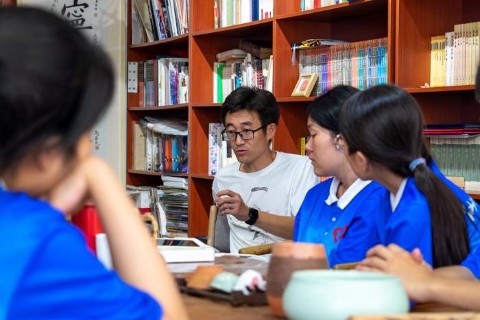 圖為實踐團與手工藝人范紹寧探討秧歌發展新方向。