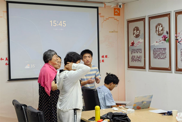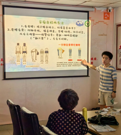 為提升知識實用性,活動安排了實踐團志愿者現場演示環節。兩位志愿者清晰展示了適用于家庭的脊柱側彎簡易自測方法,幫助參與者掌握初步篩查技能。隊員們反復強調“早發現、早干預”原則,建議自測發現異常者及時尋求專業評估與矯正,把握干預黃金期,防止問題加重。
