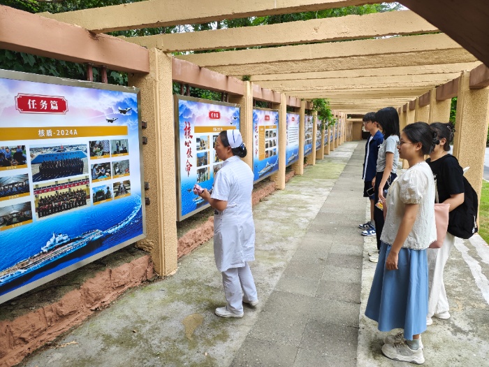 7月17日,服務(wù)隊(duì)首站走進(jìn)中國人民解放軍海軍第九七一醫(yī)院嶗山醫(yī)療區(qū)。在院方精心安排下,隊(duì)員們參觀了中醫(yī)理療科、康復(fù)訓(xùn)練中心及軍民融合醫(yī)療展廳。并了解到醫(yī)院在航海醫(yī)學(xué)中應(yīng)用中醫(yī)藥的特色成果——針對海勤人員高發(fā)的腰椎勞損、濕熱濕疹等問題,科室創(chuàng)新采用“艾灸+中藥熏蒸”聯(lián)合療法,顯著提升官兵執(zhí)勤適應(yīng)性;而訓(xùn)練傷康復(fù)中融入的推拿正骨手法,更使恢復(fù)周期縮短30%。