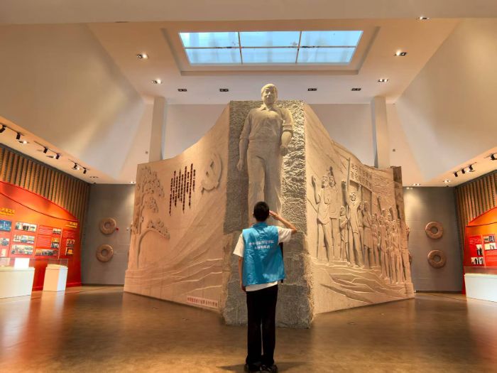 移步沈浩同志紀念館,館內的影像資料、實物展品系統展現了其“兩任村官,六載離家,總是和農民面對面,肩并肩”的奉獻歷程。在“紅手印”雕塑前,成員們駐足良久——這枚凝聚著小崗村民挽留沈浩的紅手印,與“大包干”時的紅手印一脈相承,都是民心向背的生動見證。成員們在館內認真參觀學習,并向沈浩同志雕像致敬。