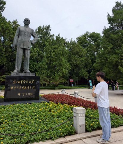 林佳豪仔細研讀群雕基座記載青島革命歷程的碑記,不時駐足沉思,在群雕前留影,以鏡頭定格對先烈的敬意。