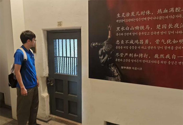 旅順日俄監獄舊址博物館,這座由俄國1902年始建、1907年日本擴建的監獄,圍墻內外占地數十萬平方米,曾關押中朝等國反戰和平人士,是近代列強侵略與殖民統治的鐵證。成員們沿“押解通道—獄室—工場—禁閉室—絞刑架遺址”路線參觀,結合口述史材料,深刻認識到近代以來為民族獨立和人民解放頑強奮斗的仁人志士的崇高精神,也更加明白青年一代傳承紅色基因的責任。