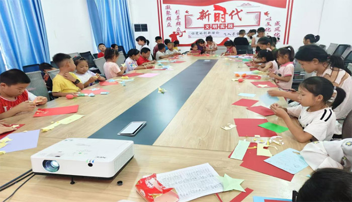 “老師,您看我剪的五角星圓不圓?”“老師,我的紅旗貼歪了怎么辦?”孩子們時不時地向志愿者們請教,現(xiàn)場充滿了歡聲笑語。
