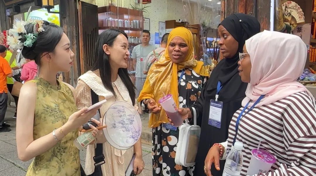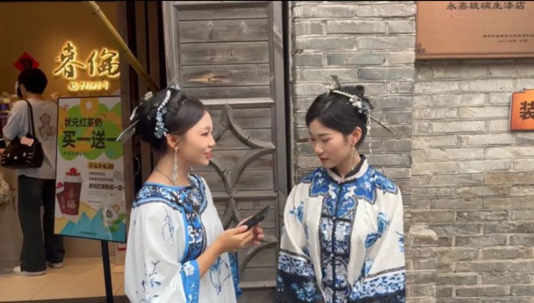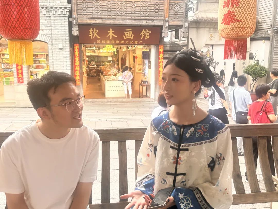 三、簪聯中外:偶遇街頭知音,彰顯文化國際魅力午后,佩戴著三條簪的同學們成了古巷中最動人的風景。本地阿婆圍攏過來,滿眼懷念;外國游客也被吸引,主動交流。同學們用英語介紹其歷史與寓意,令外國友人贊嘆不已。