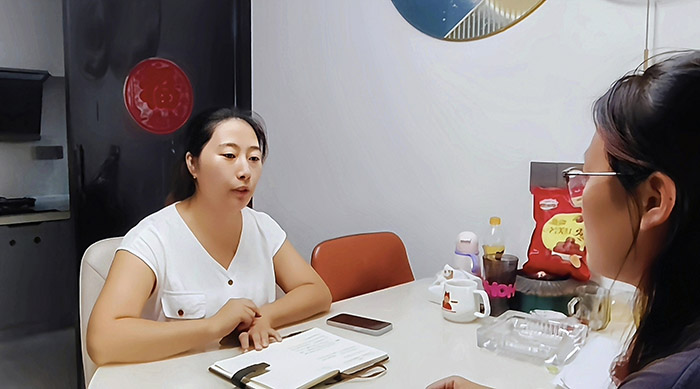 圖為實踐隊成員茹譯萱與暖辿村村支部委員會委員李云菲開展主題訪談(成柏霖供圖)