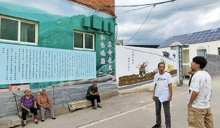 ?圖為實踐隊在觀腰村村支部委員張奎義的帶領下參觀“彩繪墻”(成柏霖供圖)