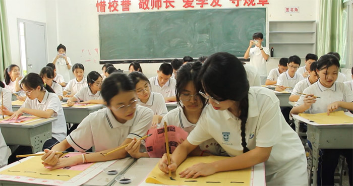 ?。▓D2:書法課上老師指導學生提筆書寫)