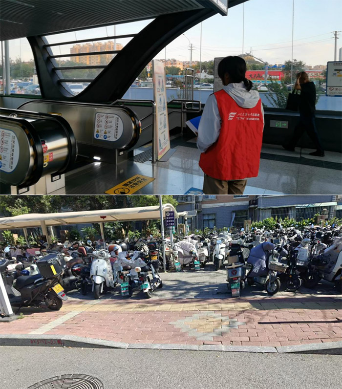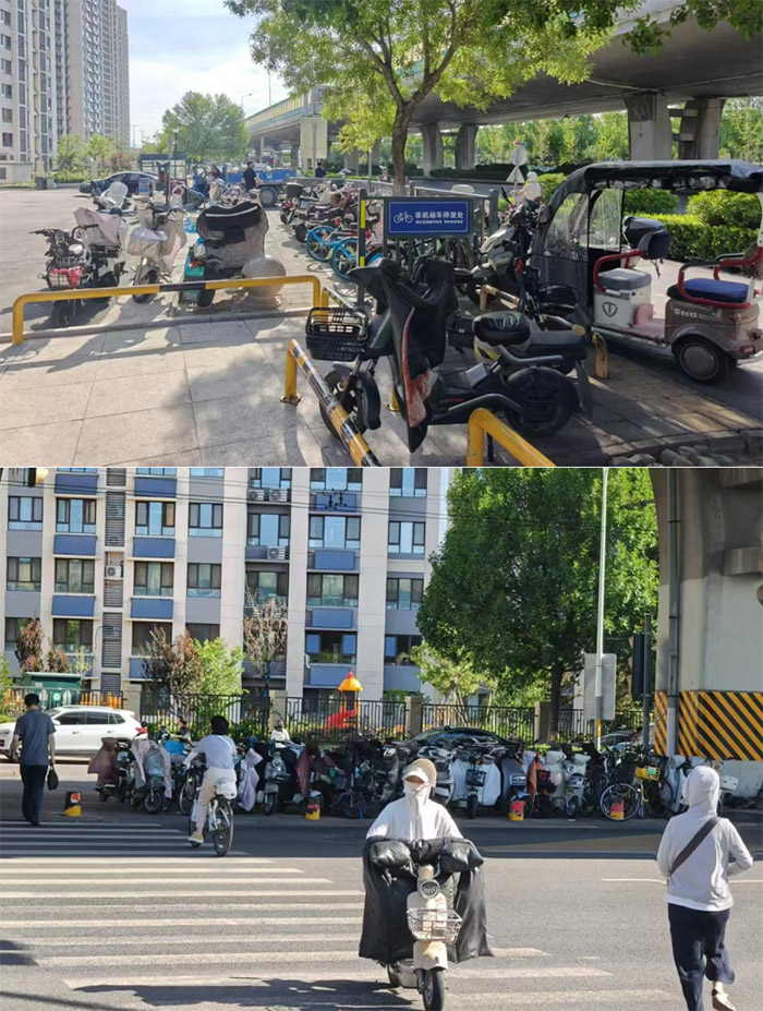 次日,實踐小組又重新分為早晚兩組,分別對鮑山站的早晚高峰進行細致化調研:清晨7:10至8:00,重點記錄早高峰時段非機動車進出流量及停放秩序;上午分時段統計靜態停車數量,繪制車位使用熱力圖;傍晚17:00至19:00,持續監測晚高峰人流車流變化。通過實地考察,發現早高峰非機動車停車處車位緊張,所有車輛密集擺放,圍欄外的道路、綠植及路口處停了近400輛非機動車,造成道路擁擠,堵塞路口等問題。
