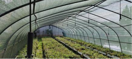 工作人員介紹到,鐵皮石斛栽培在大棚中進(jìn)行,要注意控制大棚的光照、溫度、濕度、通風(fēng)等因素,大棚還要有防蟲(chóng)網(wǎng)。水分管理是鐵皮石斛栽培過(guò)程中的關(guān)鍵環(huán)節(jié)之一,我們同樣可以觀(guān)察到在大棚中,育苗行與行之間土壤潮濕,近似泥澤,其目的在于營(yíng)造鐵皮石斛生長(zhǎng)最適宜的濕度。種植大棚中同時(shí)也安裝了大棚噴水設(shè)備來(lái)保持空氣濕度。