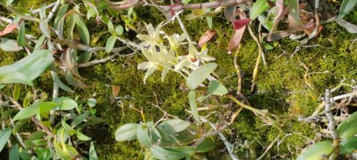 鐵皮石斛是附生植物,在自然條件下主要生長(zhǎng)于一些高大喬木陰濕的樹(shù)干或石灰?guī)r上。我們觀(guān)察到,在大棚種植過(guò)程中,為了模擬自然環(huán)境,鐵皮石斛植株下并不是簡(jiǎn)單是營(yíng)養(yǎng)土,而是附著厚厚一層苔蘚地衣的培養(yǎng)土。