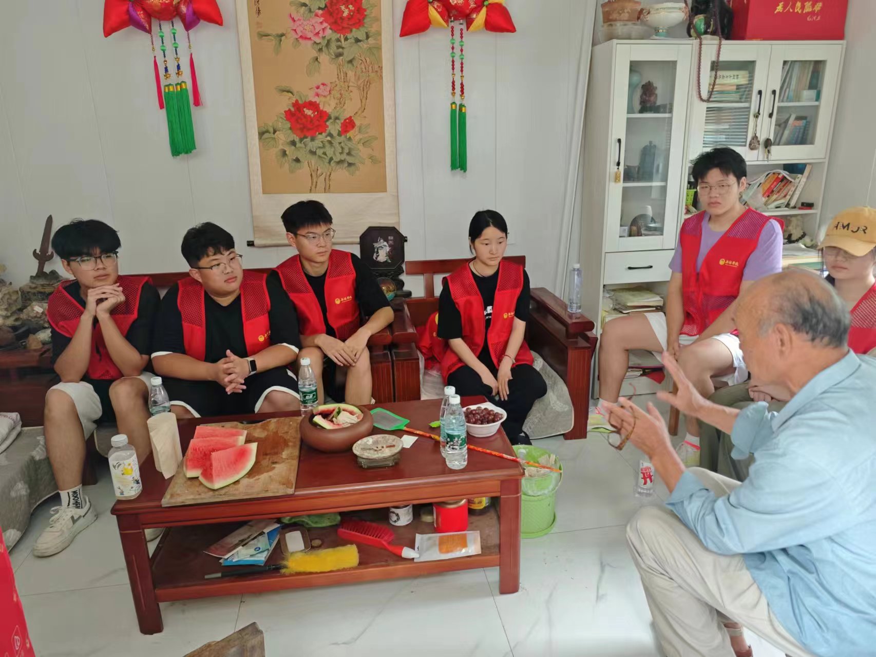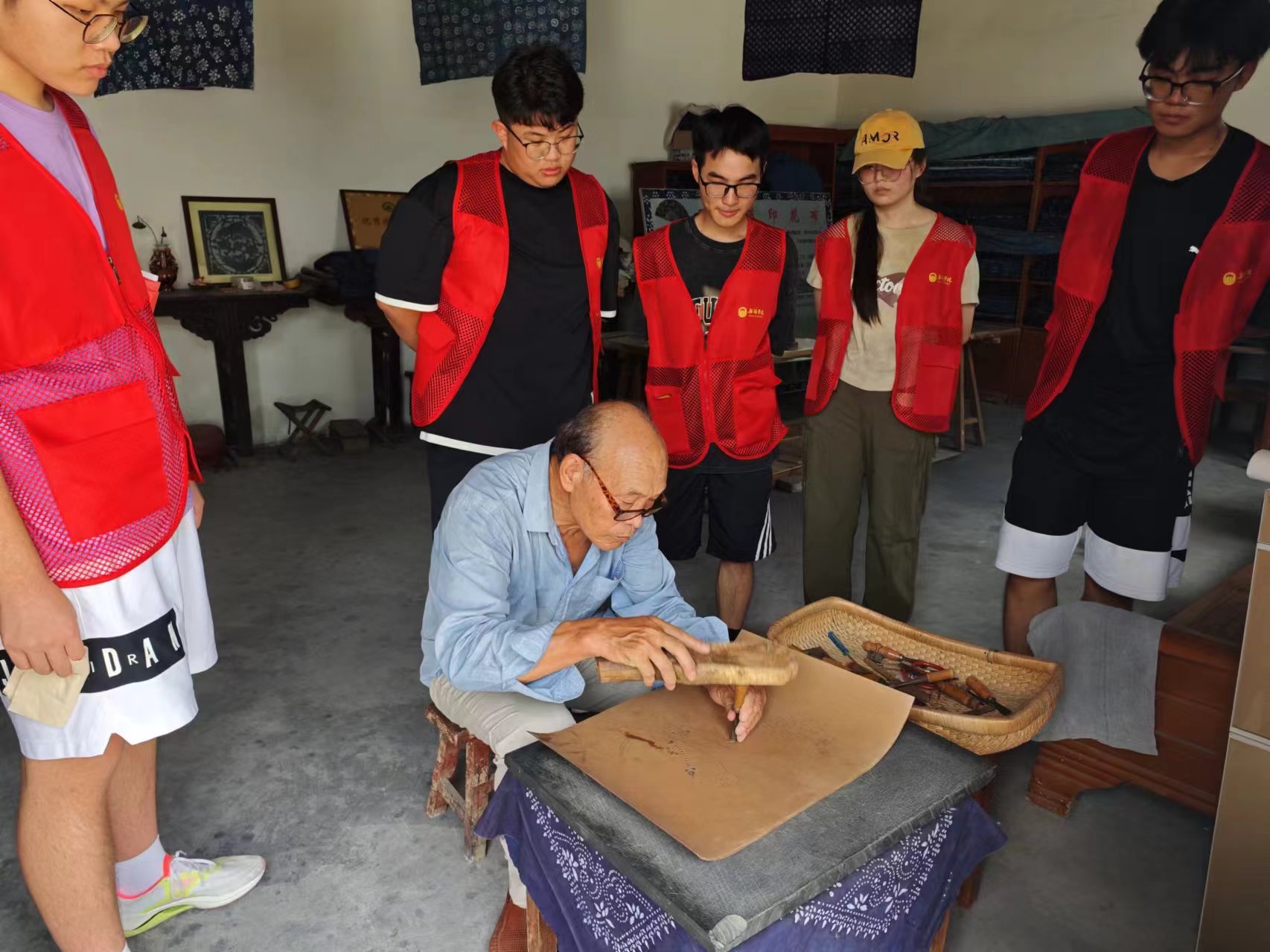 團隊成員首先前往傳承人家中進行拜訪。在這里,團隊成員見到了藍印花布省級傳承人王如坤先生。現(xiàn)年74歲的老先生熱情接待了團隊成員,王如坤先生將一生奉獻給藍印花布這項古老藝術。為了藍印花布的傳承與發(fā)展,他耗盡家資建立起了印染坊及藍印花布藝術館。小隊成員在傳承人家中得到了熱情款待,傳承人認真回答了團隊成員提出的問題,并給團隊成員講解了傳承非遺文化遇到的困境和挑戰(zhàn),同時,傳承人將自己在傳承非遺文化中的心得和體會傾囊相授。