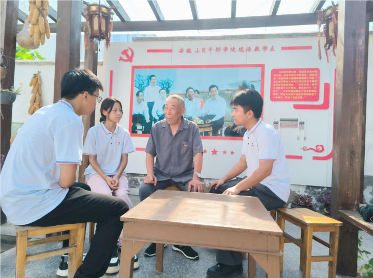 小崗村是中國農村改革的發源地,18位大包干領頭人的壯舉開啟了農村改革的新篇章。團隊成員聆聽關友江爺爺講述當年敢為人先、實行家庭聯產承包責任制的艱難歷程和輝煌成就,分享了鄉村振興道路上的經驗與教訓。關友江爺爺從生活、文化等方面說道,“小崗村村民生活發生了翻天覆地的變化,從沒得吃沒得穿到吃不愁穿不愁,黨的政策引領著家家戶戶奔小康;在文化上,小崗村建立了文化廣場,大家用鳳陽花鼓歌頌黨的好政策,村里一所所學校也建了起來,從幼兒園到中學,孩子們的教育有了保障!”同時寄語同學們“科技是第一生產力,掌握了知識才能運用好科技,大家一定要堅定理想信念,永遠跟黨走,勤奮學習,扎實本領,報效祖國!”