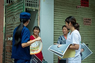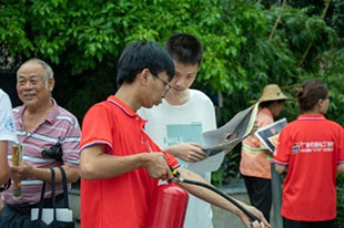 圖為實(shí)踐團(tuán)成員向消防員學(xué)習(xí)后向居民演示滅火器正確用法 圖為消防員帶領(lǐng)實(shí)踐團(tuán)成員入商鋪宣傳