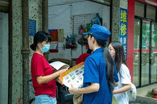 隨后,消防員帶領(lǐng)實(shí)踐團(tuán)兵分兩路,一隊(duì)在廣場向過路居民分發(fā)海報、傳單,叮囑居民牢記家庭防火“三清三關(guān)”(即:清走道、清陽臺、清廚房,關(guān)火源、關(guān)電源、關(guān)氣源。),電車不入電梯不入戶等安全防范措施,現(xiàn)場演示滅火器使用方法,科普消防知識,解答群眾的消防困惑。另一隊(duì)則在消防員的帶領(lǐng)下走街串巷,走進(jìn)沿街店鋪,入戶講解宣傳“三合一”(即經(jīng)營、倉儲、住宿“三合一”)場所要做到配備消防器材、保持通道暢通、安全用火用電等商鋪防火安全知識。